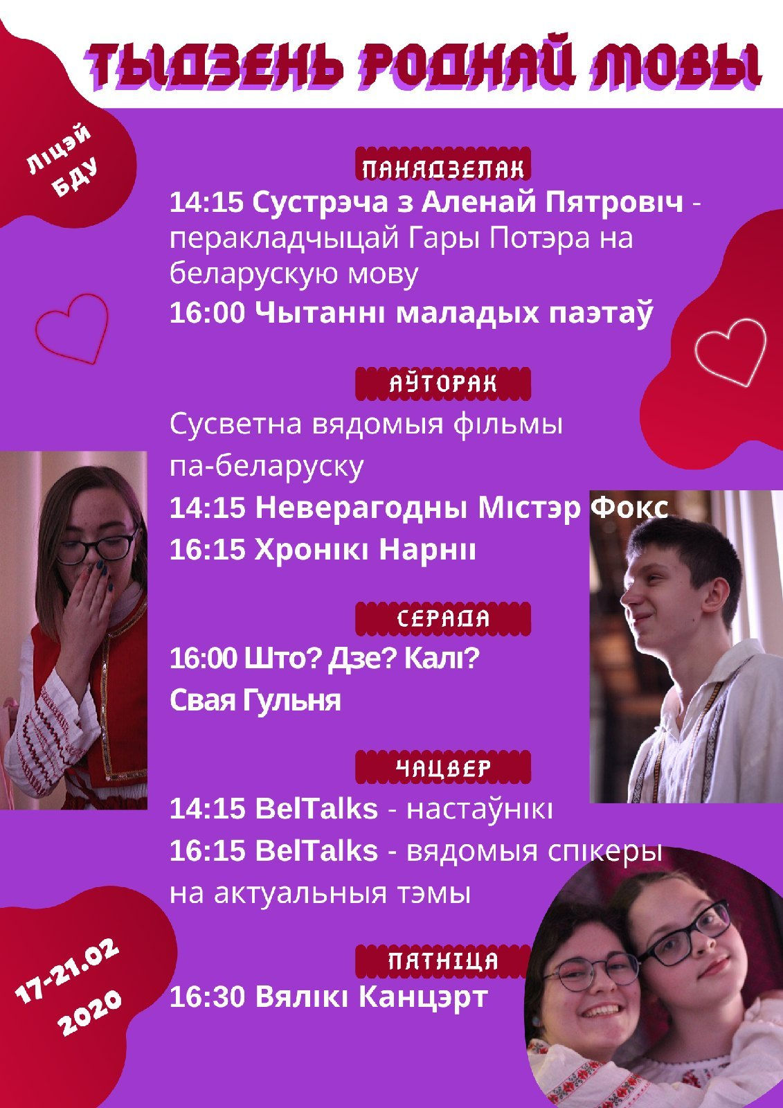 Тыдзень Роднай Мовы — гэта штогадовы ліцэйскі фэст, падчас якога праходзяць самыя розныя імпрэзы: сустрэчы з літаратарамі, выступы паэтаў, прагляды фільмаў па-беларуску, BelTalks — выступы настаўнікаў і запрошаных спікераў на актуальныя і цікавыя тэмы, канцэрты і процьма чаго яшчэ.
