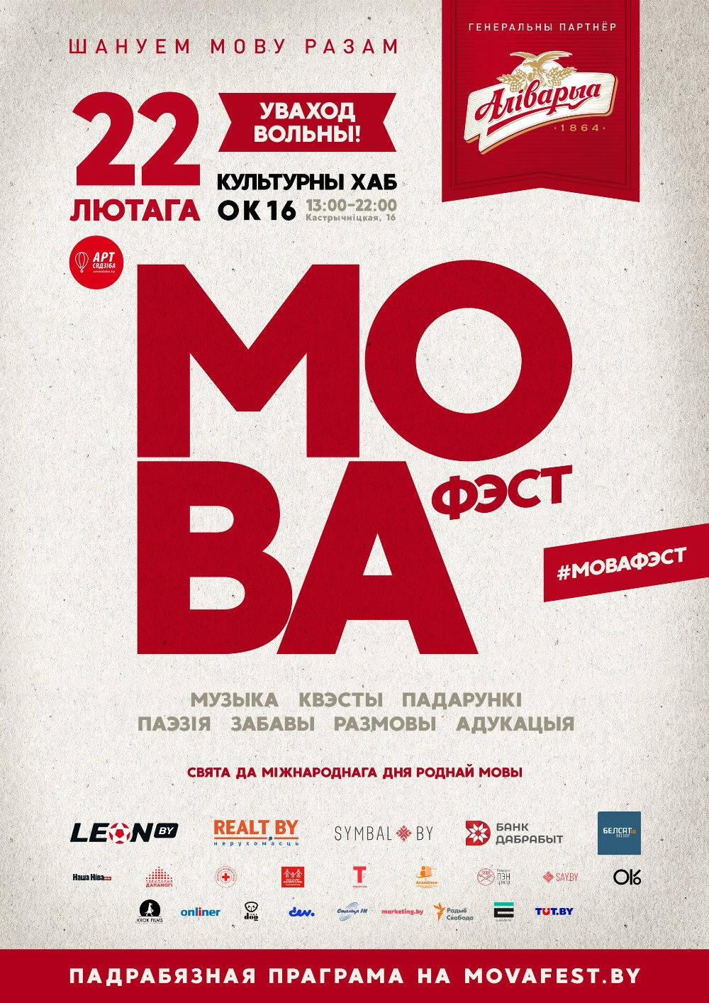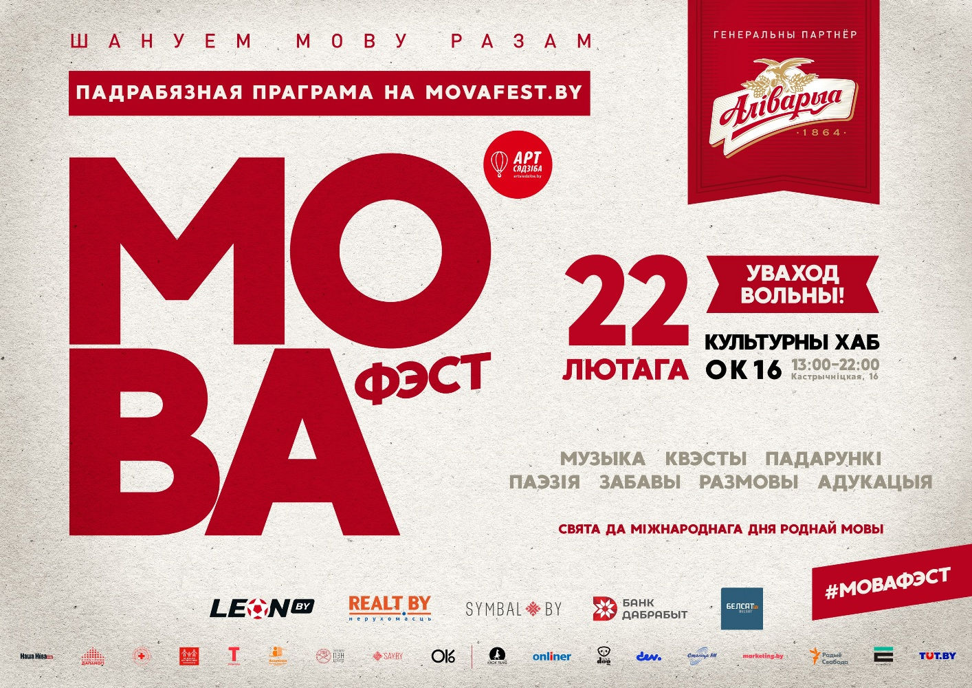 22 лютага ў мінскім культурным хабе «ОК16» (вул. Кастрычніцкая, д. 16, к. 27) «Арт Сядзіба» пры падтрымцы генеральнага партнёра «Аліварыя» збірае разам 50 беларускіх кампаній, арганізацый, ініцыятыў і творчых калектываў, каб годна правесці маштабнае і ўнікальнае свята «Мова Фэст», прымеркаванае да Міжнароднага дня роднай мовы.