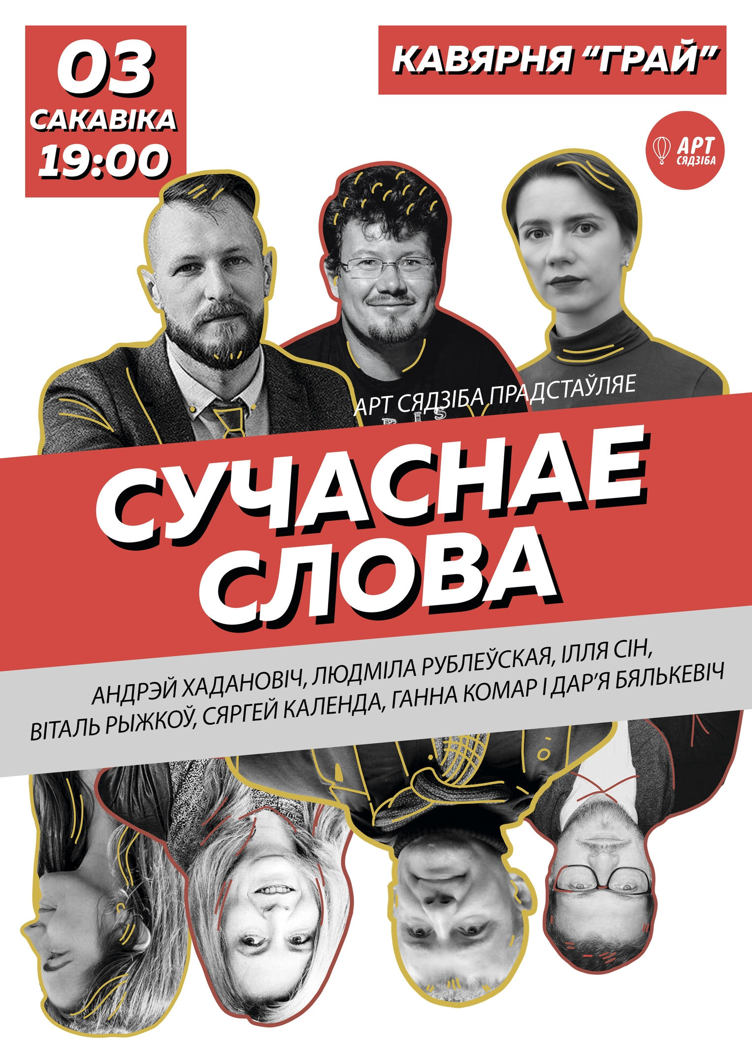 Для вас выступяць сучасныя беларускія пісьменнікі і паэты, такія як Андрэй Хадановіч, Людміла Рублеўская, Ілля Сін, Віталь Рыжкоў, Сяргей Календа, Ганна Комар і Дар’я Бялькевіч.