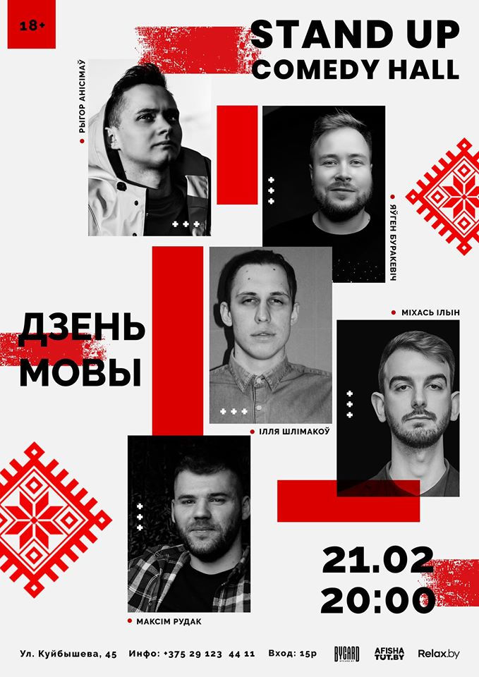 21 лютага стэндап па-беларуску. На сцэне StandUp Comedy Hall (Мінск, вул. Куйбышава, 45) выступяць адныя з лепшых і цікавых прадстаўнікоў беларускай камедыі, якія будуць жартаваць выключна на беларускай мове.