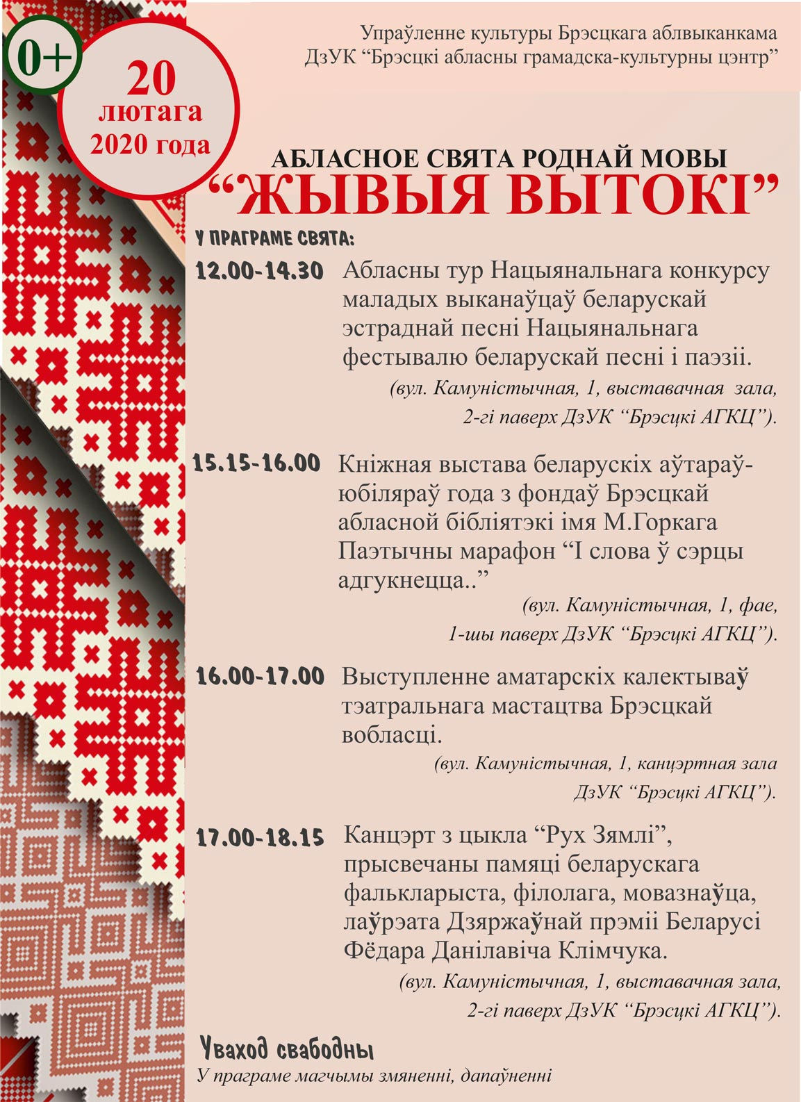 20 лютага 2020 года Брэсцкі абласны грамадска-культурны цэнтр запрашае ўсіх на абласное свята роднай мовы «Жывыя вытокі».